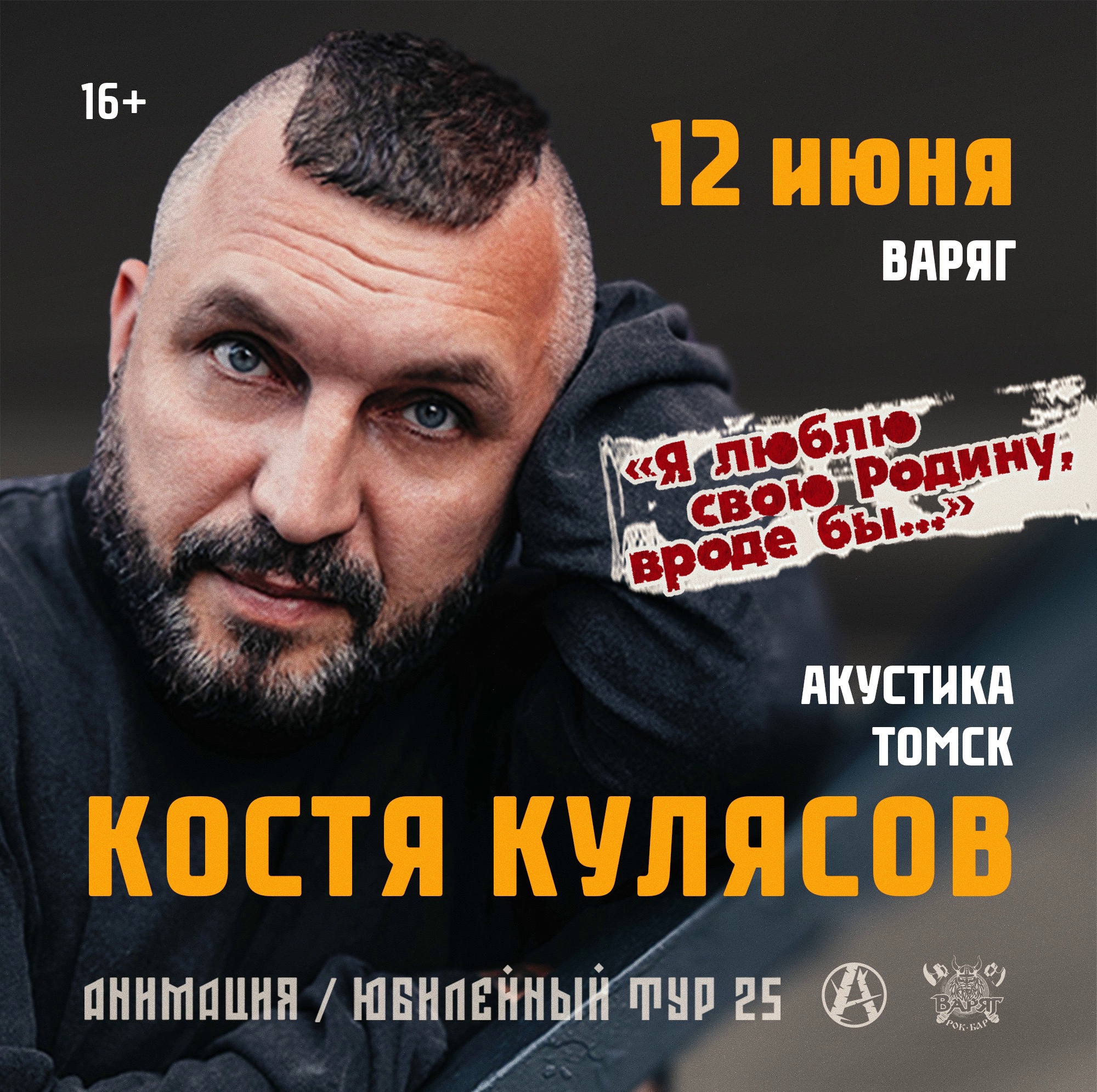 12 июня 2025 года на сцене Томского рок-клуба "Варяг" состоится сольный концерт лидера группы «АнимациЯ» Константина Кулясова с большой программой. Максимальная близость к артисту. Общение с гостями! Не пропустите!